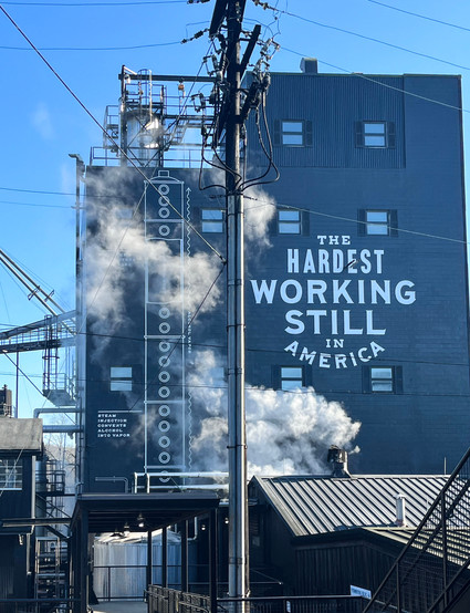 Once cooked, the mash is transferred to a fermentation tank, where it cools to approximately seventy degrees Fahrenheit. The mixture is then introduced to yeast—the same strand used since 1934—which, over the course of several days, degrades available glucose into carbon dioxide and ethanol. The resulting liquid (called “wash” or “distiller’s beer”) is pumped into a column still and heated to over two hundred degrees. At this temperature, alcohol vapors separate from water and water-soluble particles. This vapor is subsequently condensed into “low wine” (a 125 proof distillate) and pumped through a doubler for a second distillation. The final result is a 160 proof “high wine.”